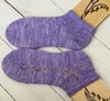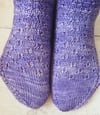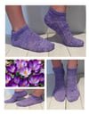 I love the deep colour of crocuses. They are the brightest of the early spring flowers in my neighbourhood and create these clumps of bright purple with an orange centre. The crocus socks use a slipped stitch technique to mimic the long lozenge petals and to create perfectly round eyelet holes. These socks are a fast, straightforward knit with a timeless feel.